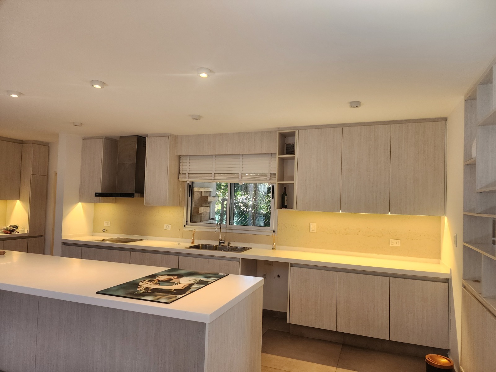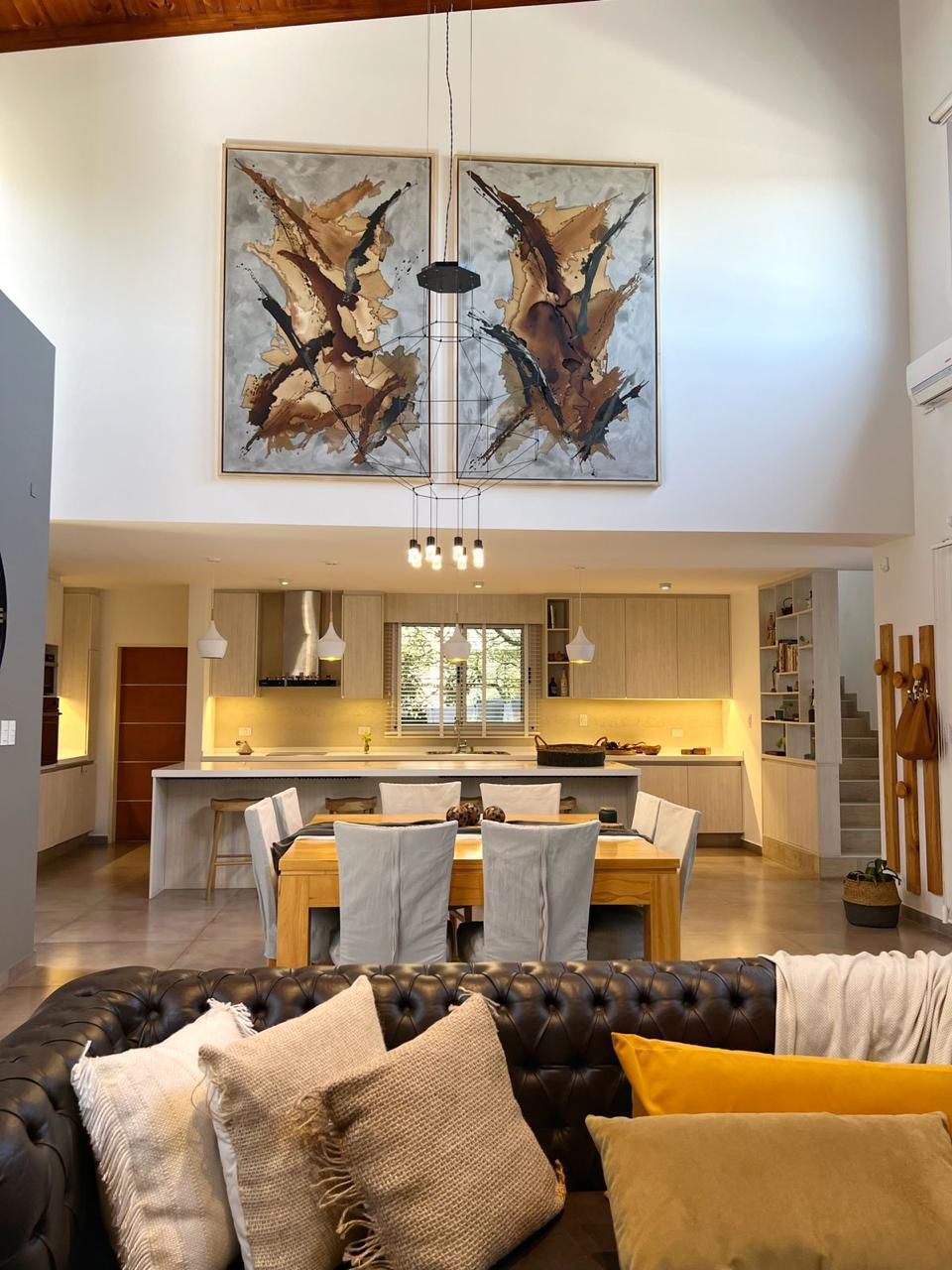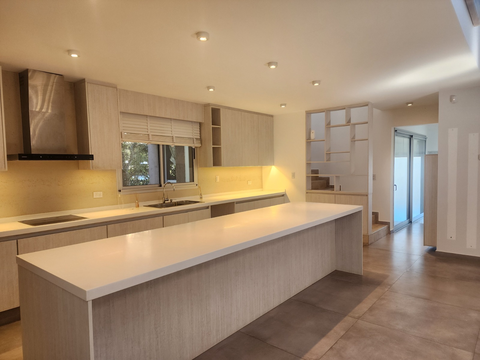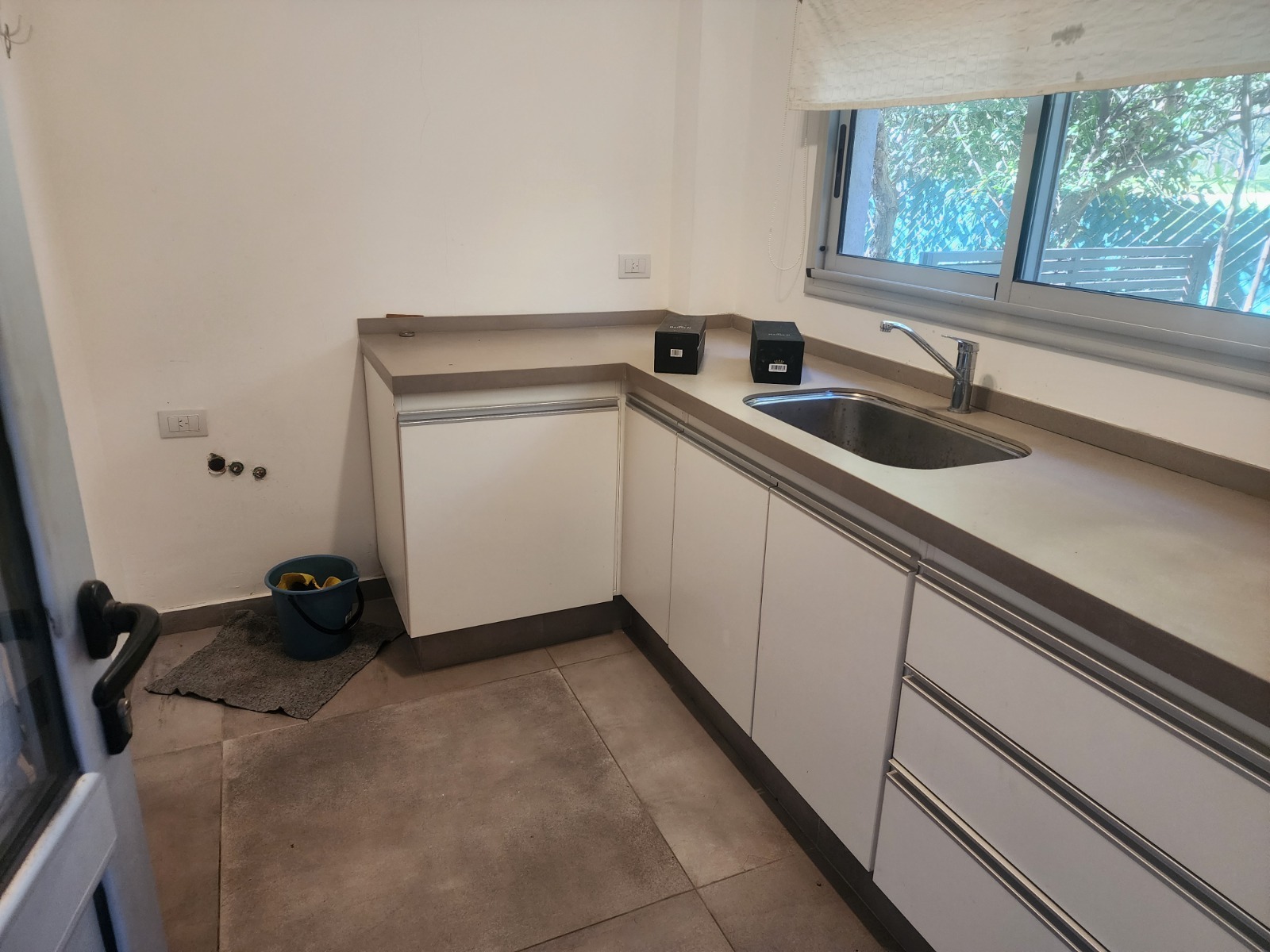 La propiedad se distribuye en los siguientes ambientes: living comedor de gran tamaño con isla, cocina de estilo moderno con la cocina de cocinar digital con campana y mobiliario de melamina, 2 dormitorios (proyecto para un tercer dormitorio aprobado), 3 baños, quincho techado con asador y anafe, cochera para dos vehículos y lavadero
