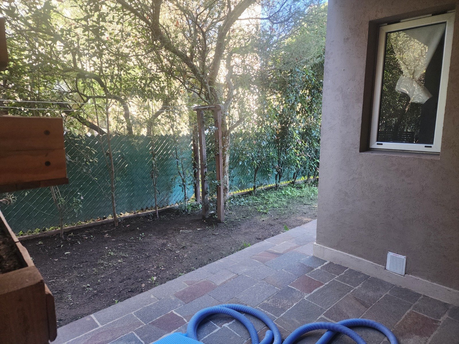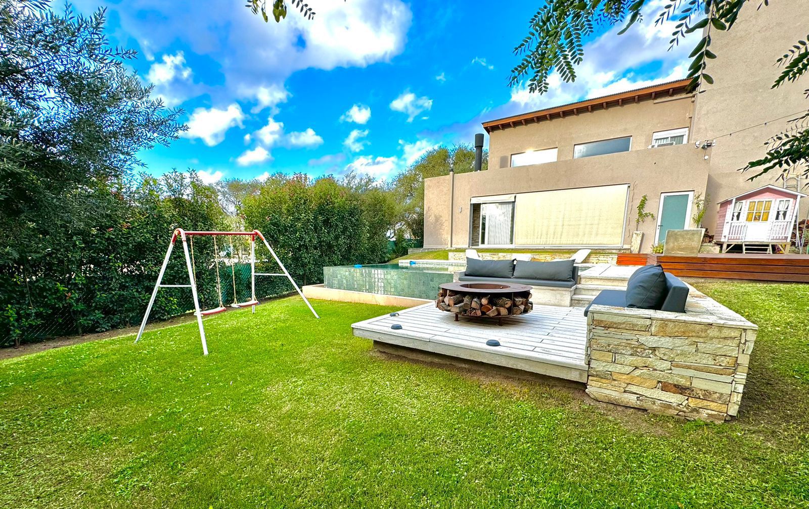 Patio parquizado con sistema de riego automatizado por aspersión y una pileta con piedra Bali climatizada.